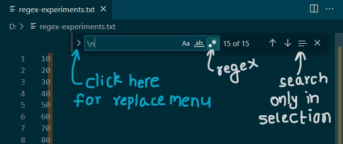 VSCode primary support for regular expressions. Find and replace menu dialog can be opened with Ctrl + F key combination.