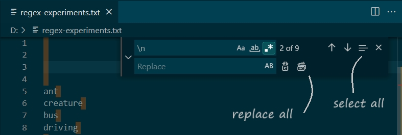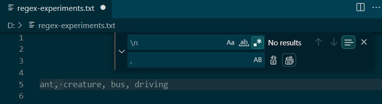 We can search for new lines, carriage return, tabs, and spaces. Here for example, we would like to replace new line with comma (,) so that all the entries will be in csv.